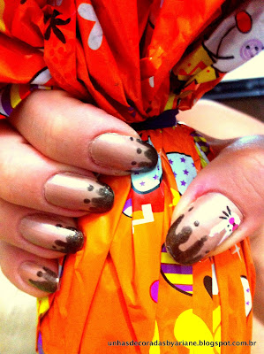 A atriz usou um esmalte com efeito speckled em que misturava tons de laranja e preto.